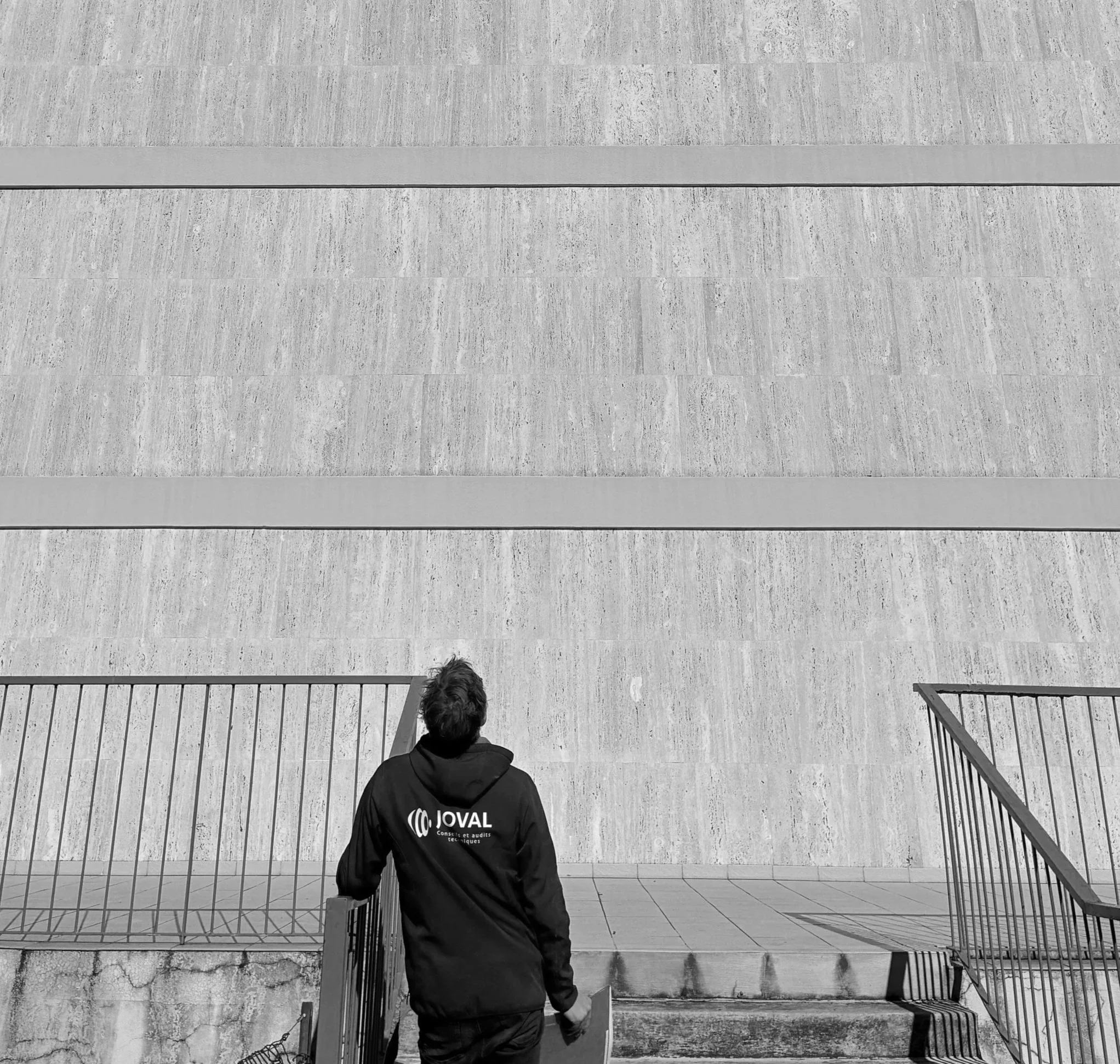 Un homme vêtu d'une veste noire avec le logo "JOVAL" inscrit à l'arrière, se tenant sur un escalier extérieur en béton près d'une grille en métal, regardant vers un mur en pierre. Le bâtiment est situé à Aubagne. La photo est en noir et blanc.